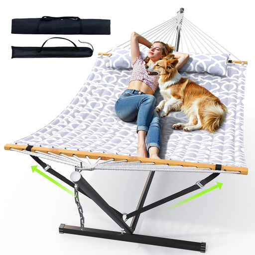 ANAGOO Double Hammock with Stand for Outdoor, Heavy Duty Portable Hammock with Adjustable Steel Stand for Patio, Garden, Beach, Backyard - Includes Carrying Bag,White Grey