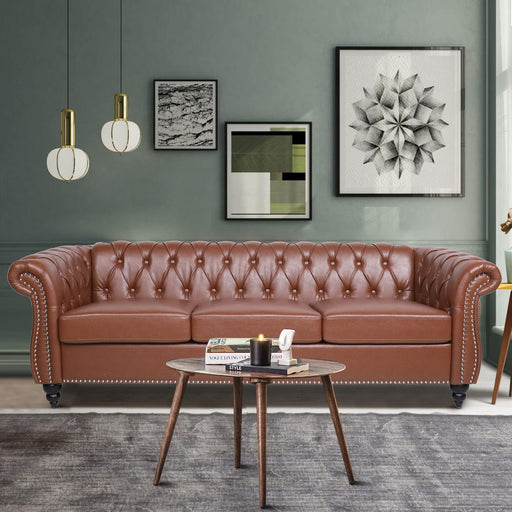 chairus Mid Century Modern 74.5" Faux Leather Sofa, 3 Seater Tufted Upholstered Couch with High Back & Nailhead Trim, Chesterfield Sofa for Living Room Bedroom Apartment Office, Brown PU