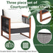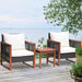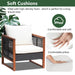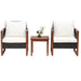 Details: Product Description: Elevate your outdoor living space with our 3 Pieces Patio Set, crafted from high-quality materials for durability and style. Featuring a solid wood frame and hand-woven rattan design, this patio furniture set exudes elegance and charm. The set includes two rattan chairs with water-resistant cushions and a 17.7”Lx17.7”Wx16.5”H acacia wood coffee table, creating the perfect spot for relaxation and conversation in your patio or garden.
