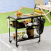 • 【Convenient Storage】The bottom shelf underneath the grill cart provides ample space for stacking a variety of items. Additionally, the front tray is designed to hold spice and sauce bottles or other small items, and the brackets can be used to hang cooking utensils and towels